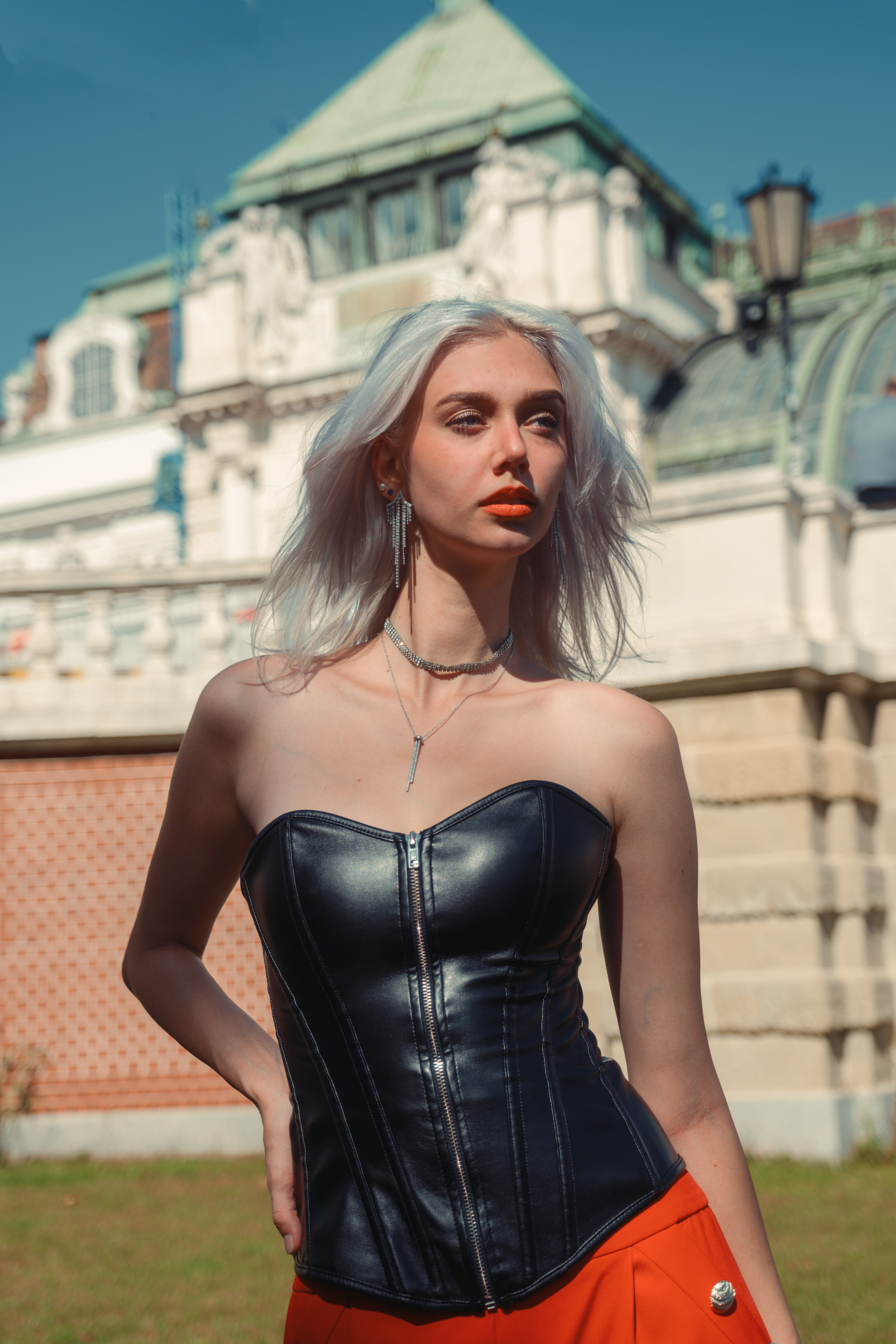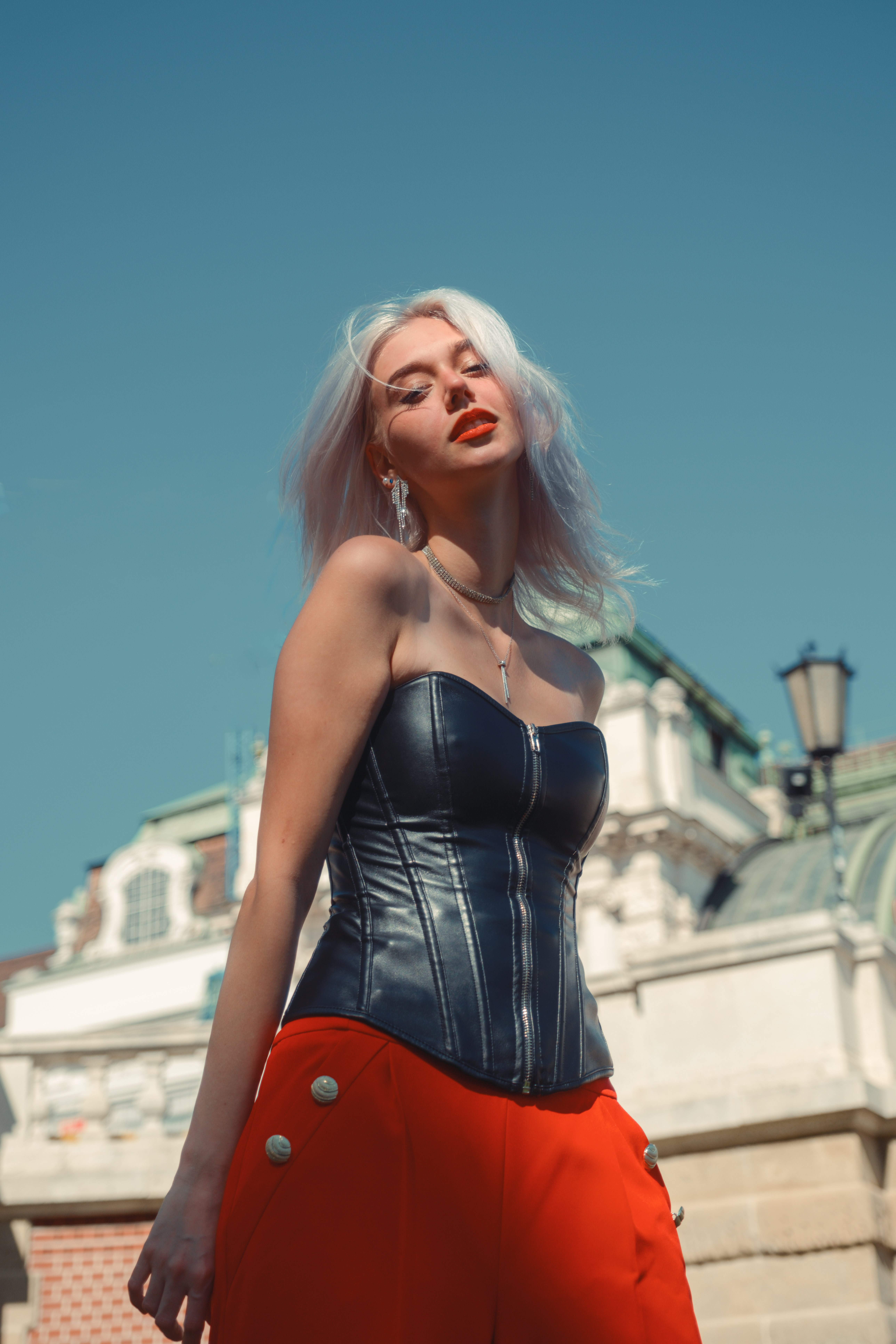 We started in the streets of Vienna, where she wore a bold black corset and red pants that turned heads against the soft neutrals of the historic architecture. The sharp tailoring and confident color gave every frame a strong, modern energy — like she owned the city with every step.