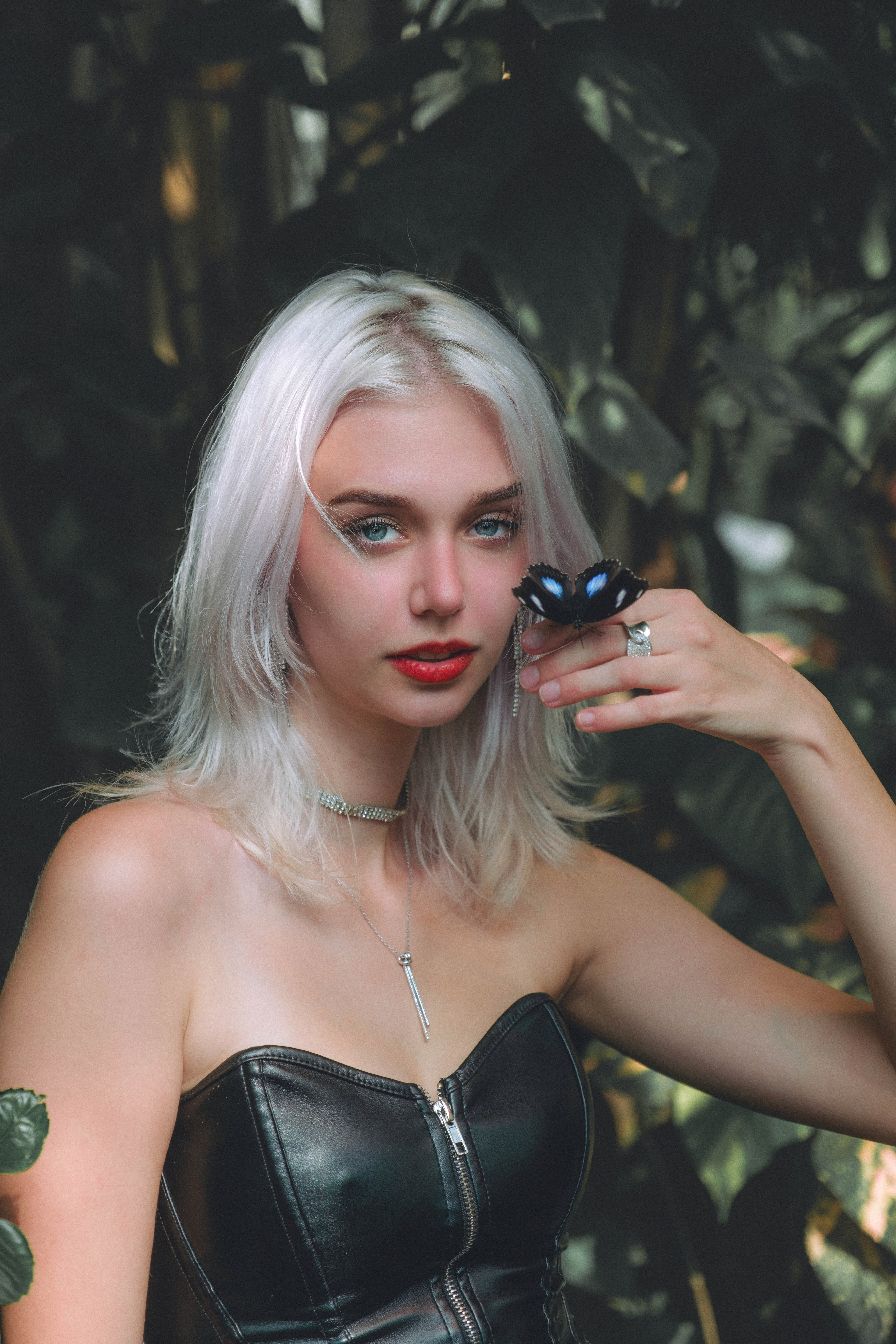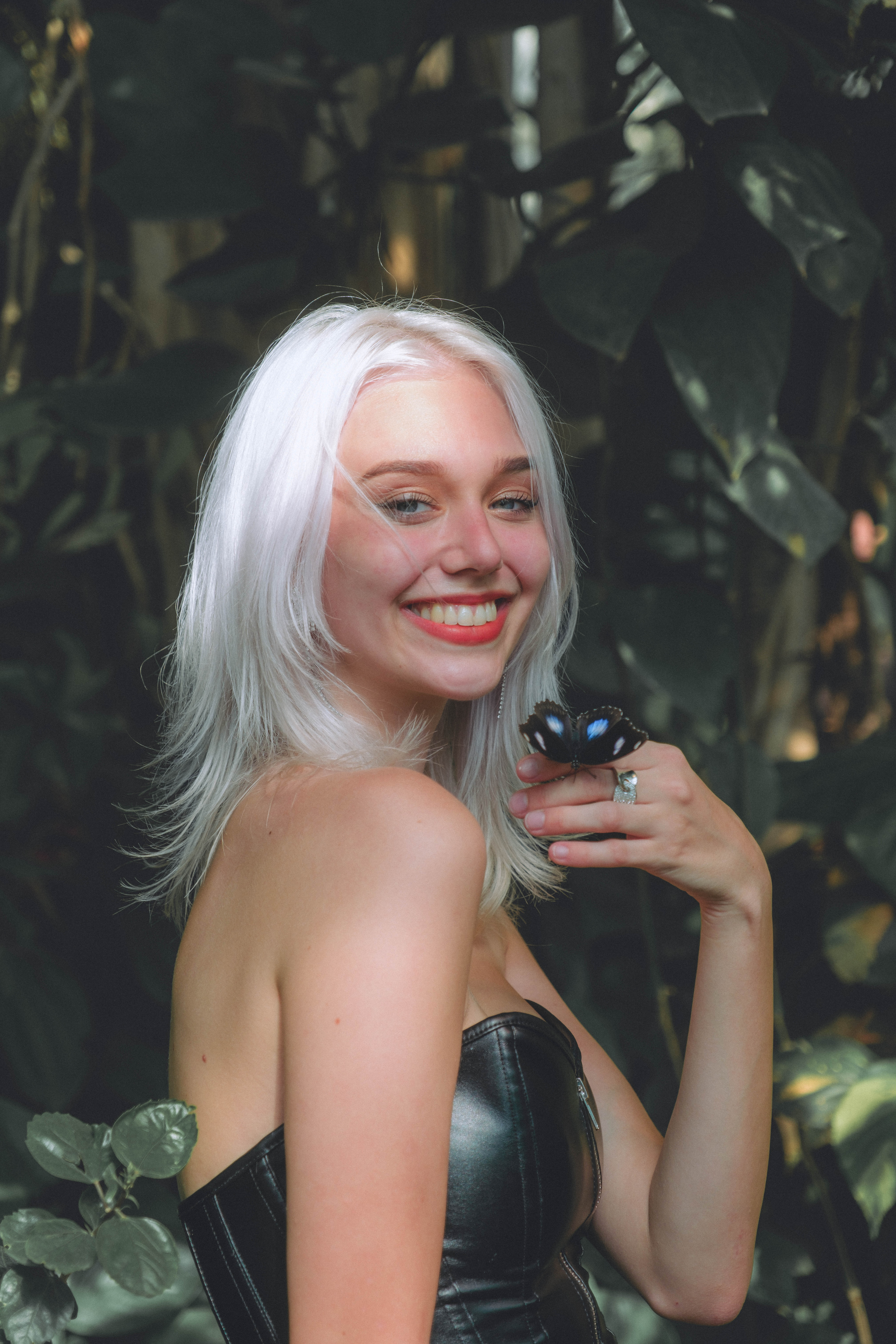 Later, we stepped into the butterfly conservatory, and the mood shifted. Surrounded by deep greens, tropical plants, and fluttering wings, the outfit took on a new life — bold but softened by the natural textures around her. The contrast between the structured look and the organic setting made each shot feel surreal and full of tension in the best way.