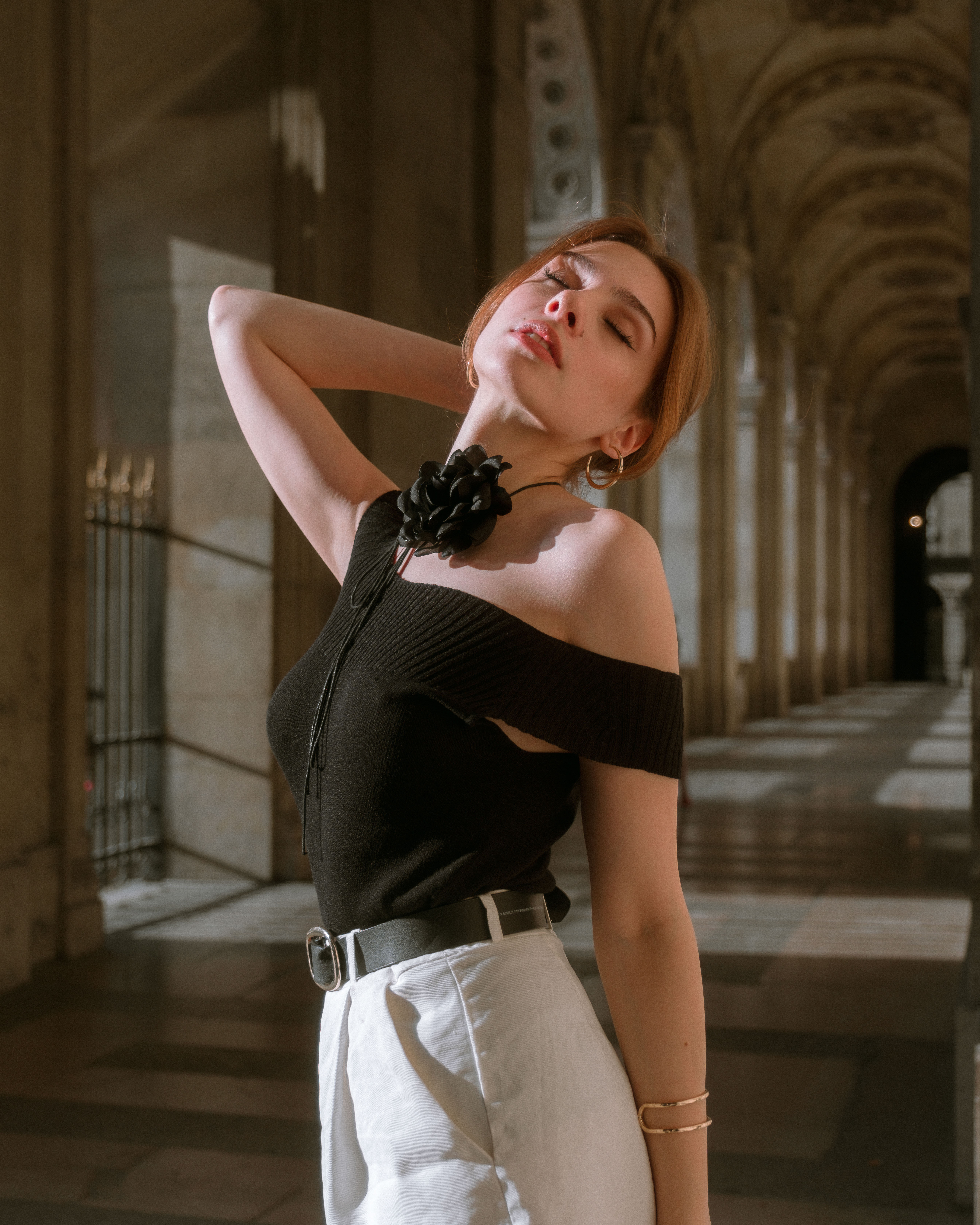 We started at the Louvre, where the sharp lines of the glass pyramid and soft morning light gave the shoot a clean, modern edge. The model’s look paired effortlessly with the surroundings — poised, polished, and full of quiet strength.